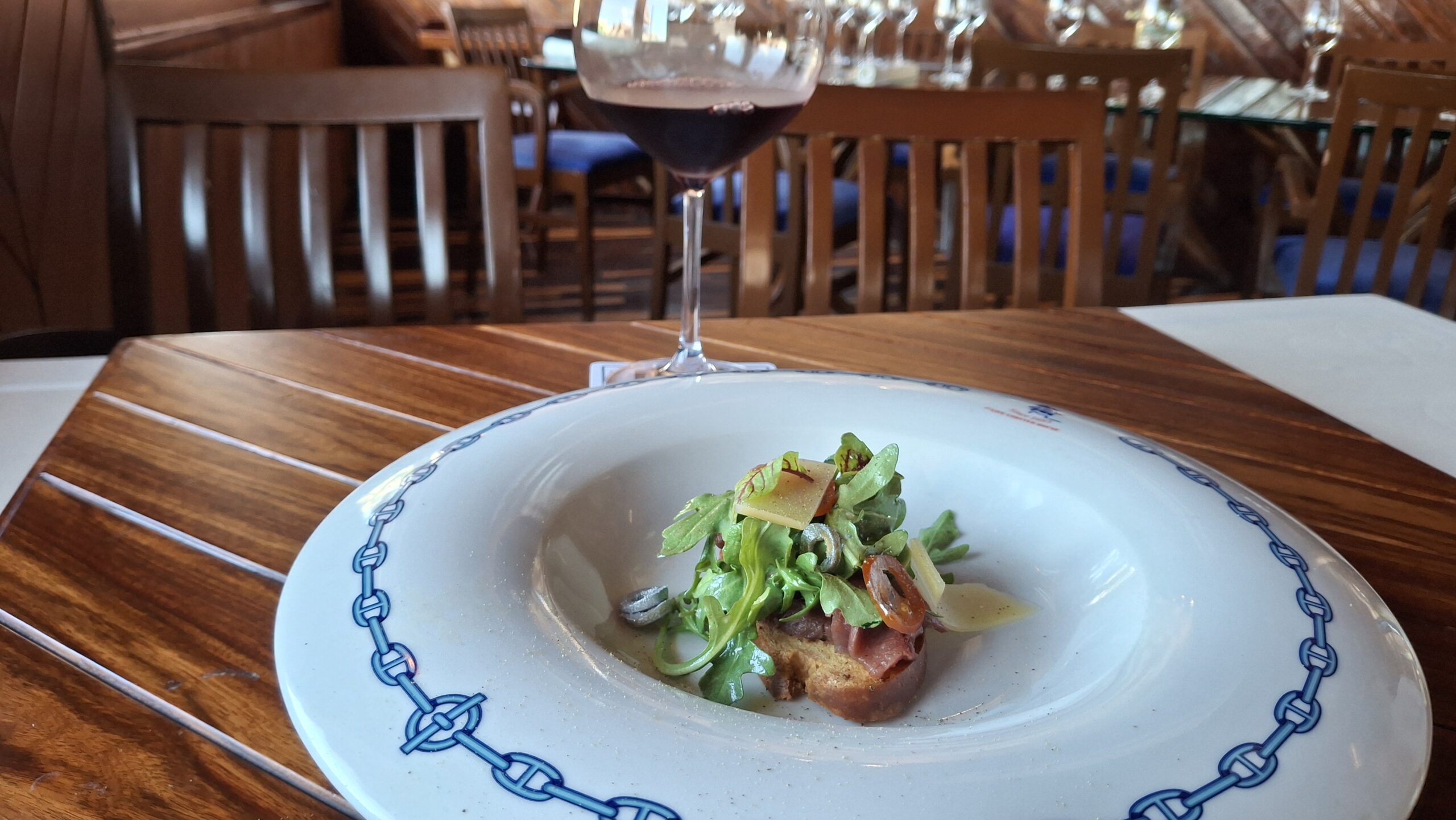 Cuarto tiempo: Bruschetta de carpaccio de res al olivo y parmesano, acompañada de Michel Torino, Cabernet Sauvignon, Argentina.