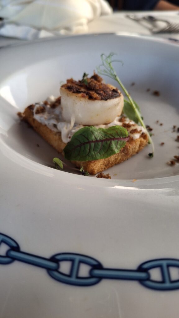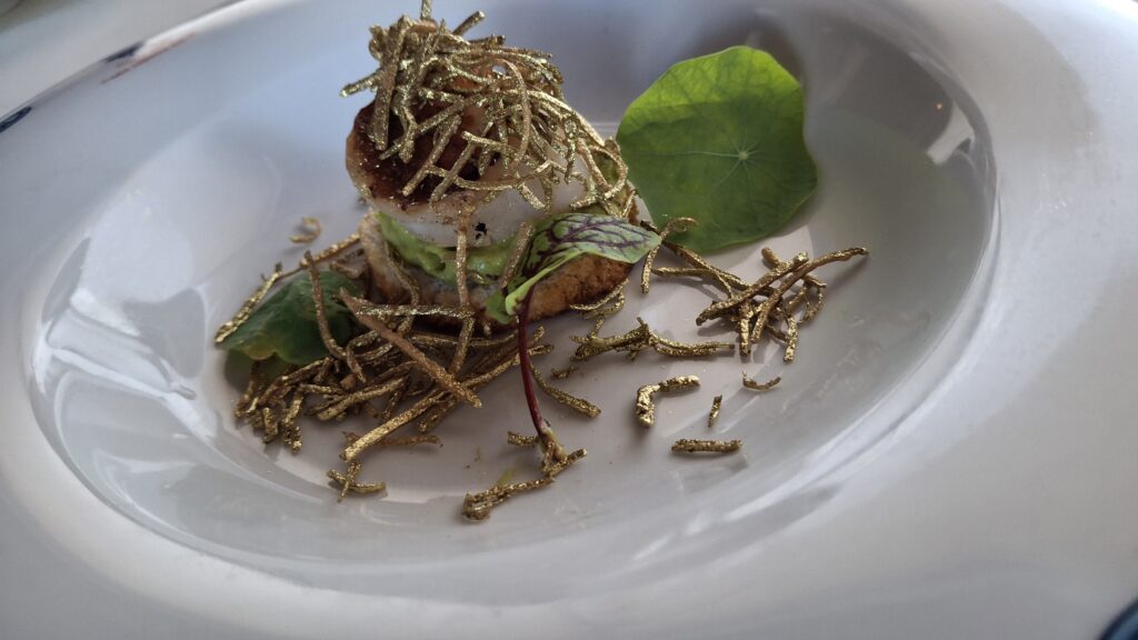 Primer tiempo: Mini croqueta de langosta acompañada de Lagar de Cervera, Albariño, España.