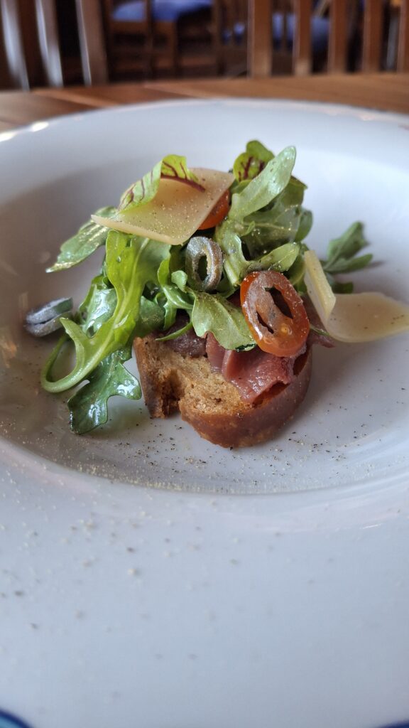 Cuarto tiempo: Bruschetta de carpaccio de res al olivo y parmesano, acompañada de Michel Torino, Cabernet Sauvignon, Argentina.