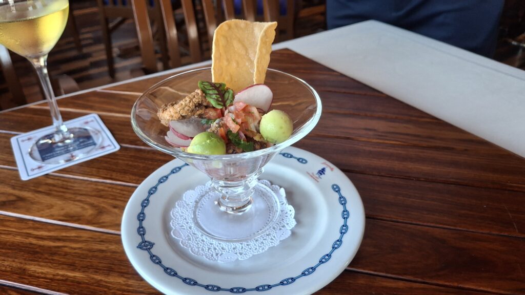 Segundo tiempo: Bruschetta de pescado a la veracruzana, maridada con Fantinel, Prosecco Glera, Italia.