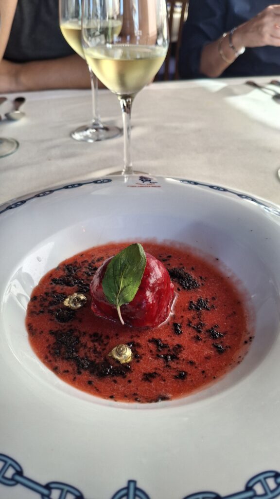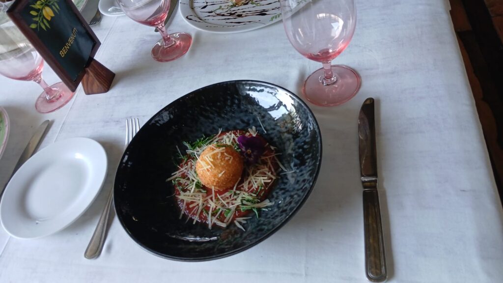 Cuarto Tiempo: La croqueta de risotto con trufa y un coulis de tomate rostizado lleva la cata a nuevas alturas, acompañada por un robusto Norton Malbec de Argentina.
