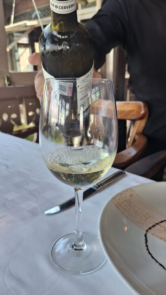 Quinto tiempo: Mini esfera de cheesecake acompañado de Cune Semi Dulce, Viura, Garnacha Blanca, España.