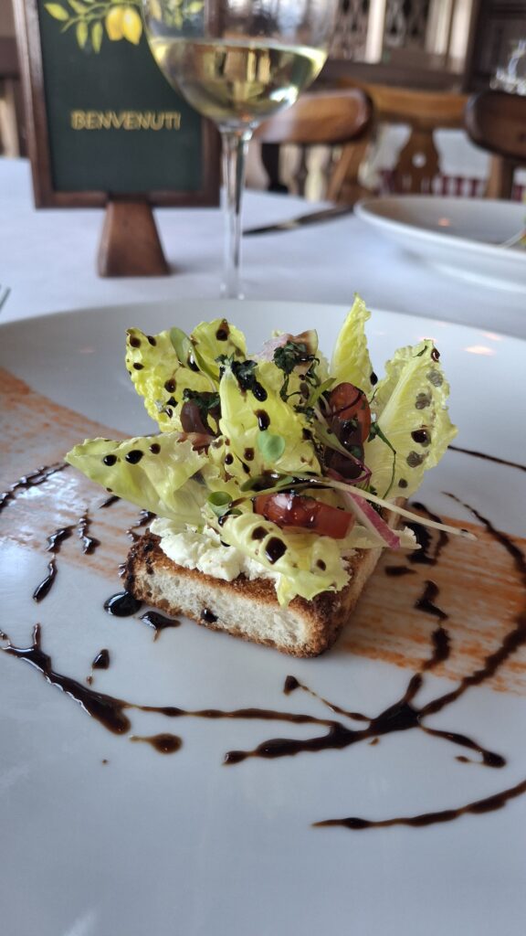 Segundo Tiempo:La bruschetta mediterránea se presenta a continuación, un deleite que incluye lechuga baby, tomate cherry, aceitunas marinadas, queso de cabra y una reducción de balsámico, acompañada de un Lagar de Cervera Albariño de España.