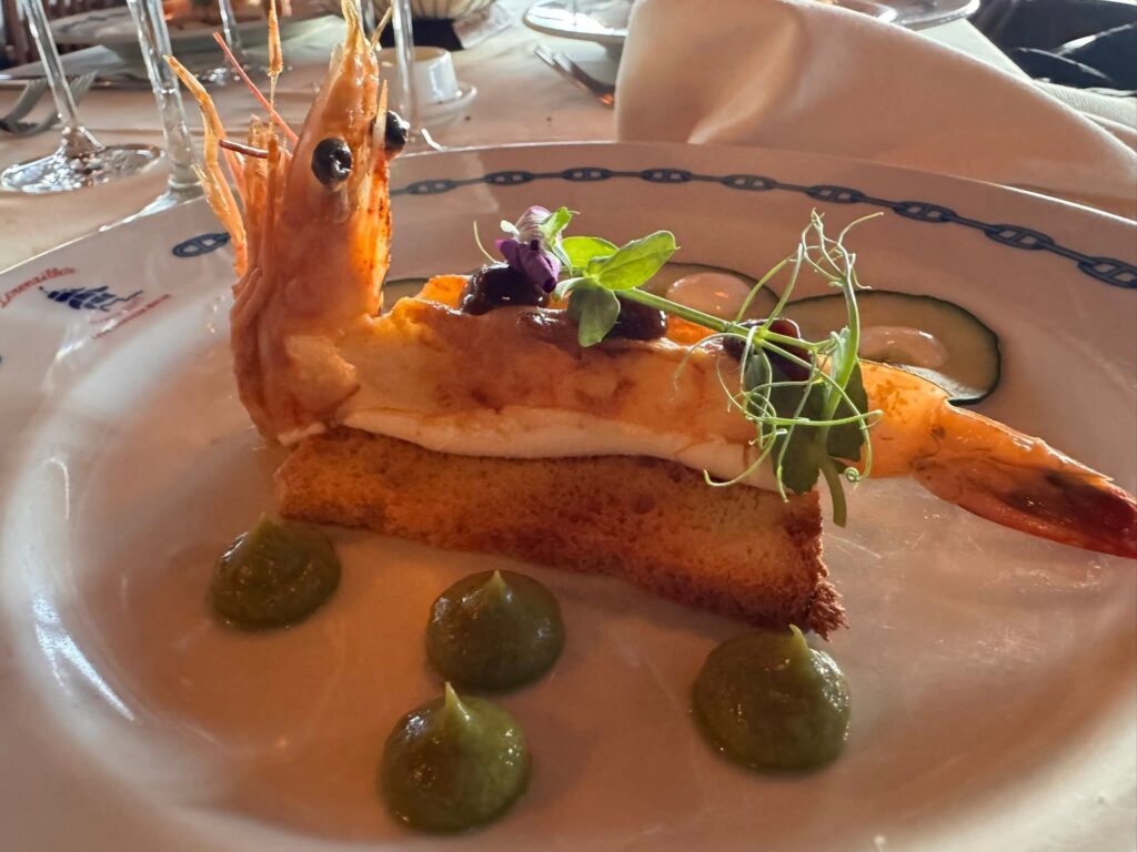 Primer tiempo: Bruschetta de camarón con salsa de ciruela y tamarindo al chipotle, acompañada de Due Uve, Pinot Grigio, Italia.