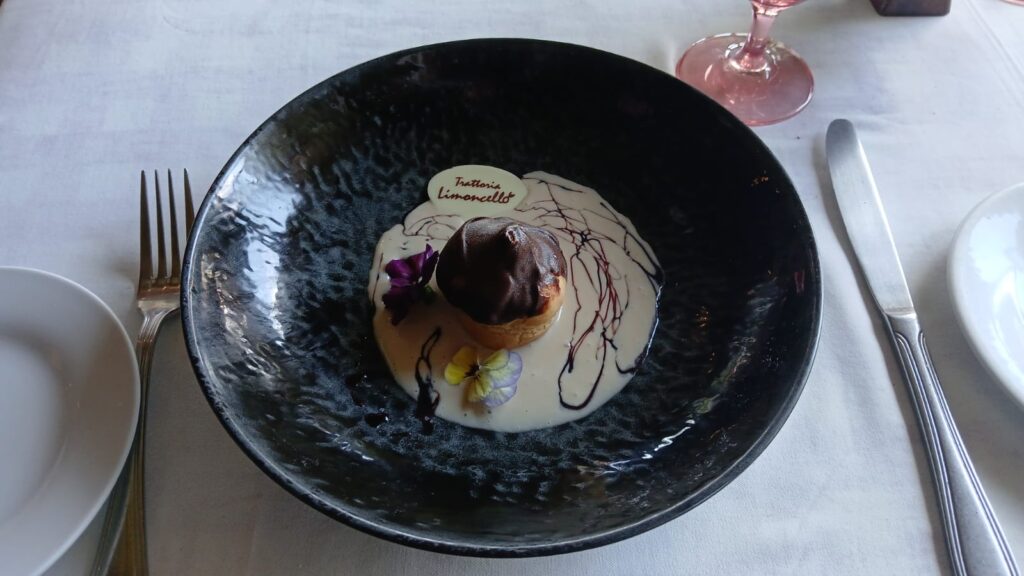 Quinto Tiempo: Para culminar, un delicioso profiterol de chocolate relleno de mousse de Baileys, rociado con salsa de amaretto, se marida con un elegante Fantinel Prosecco Brut de Italia.